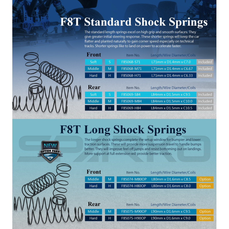 Standard-length springs are excellent on smooth, high-traction surfaces. They offer better initial steering response. These shorter springs keep the car more stable and firmly planted to the ground, thus optimizing cornering speed, especially on technical circuits. Short springs promote a better acceleration response.